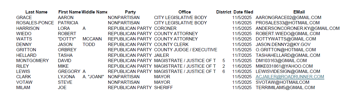 CLICK LINK TO VIEW CURRENT 2026 CANDIDATE FILINGS AS OF
